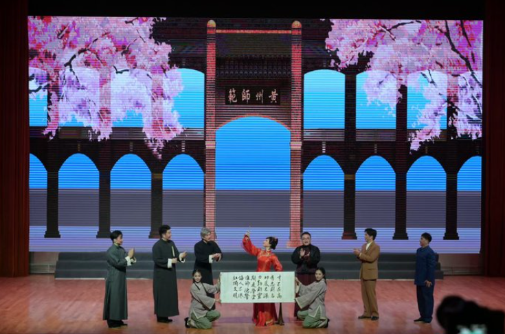 现场座无虚席、气氛热烈。学校90余名师生跨越千里,将承载着大别山红色基因的黄梅戏艺术带到宁夏,为当地师生奉献了一场融合了红色文化、师范传统与戏曲魅力的艺术盛宴。演员们精湛的表演、深情的唱腔和动人的故事,深深打动了现场每一位观众,收获了经久不息的掌声与真挚的赞誉。